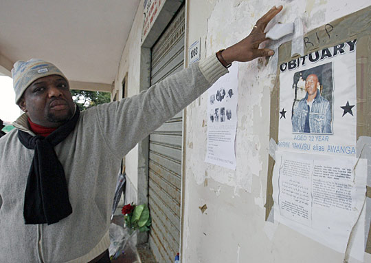 A man points to a poster showing a portrait of Karim Yabuku, one of six Ghanaians killed in Castel Volturno.